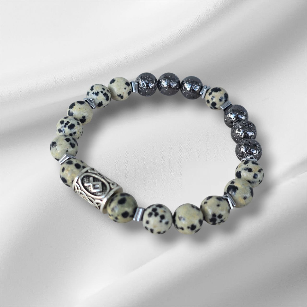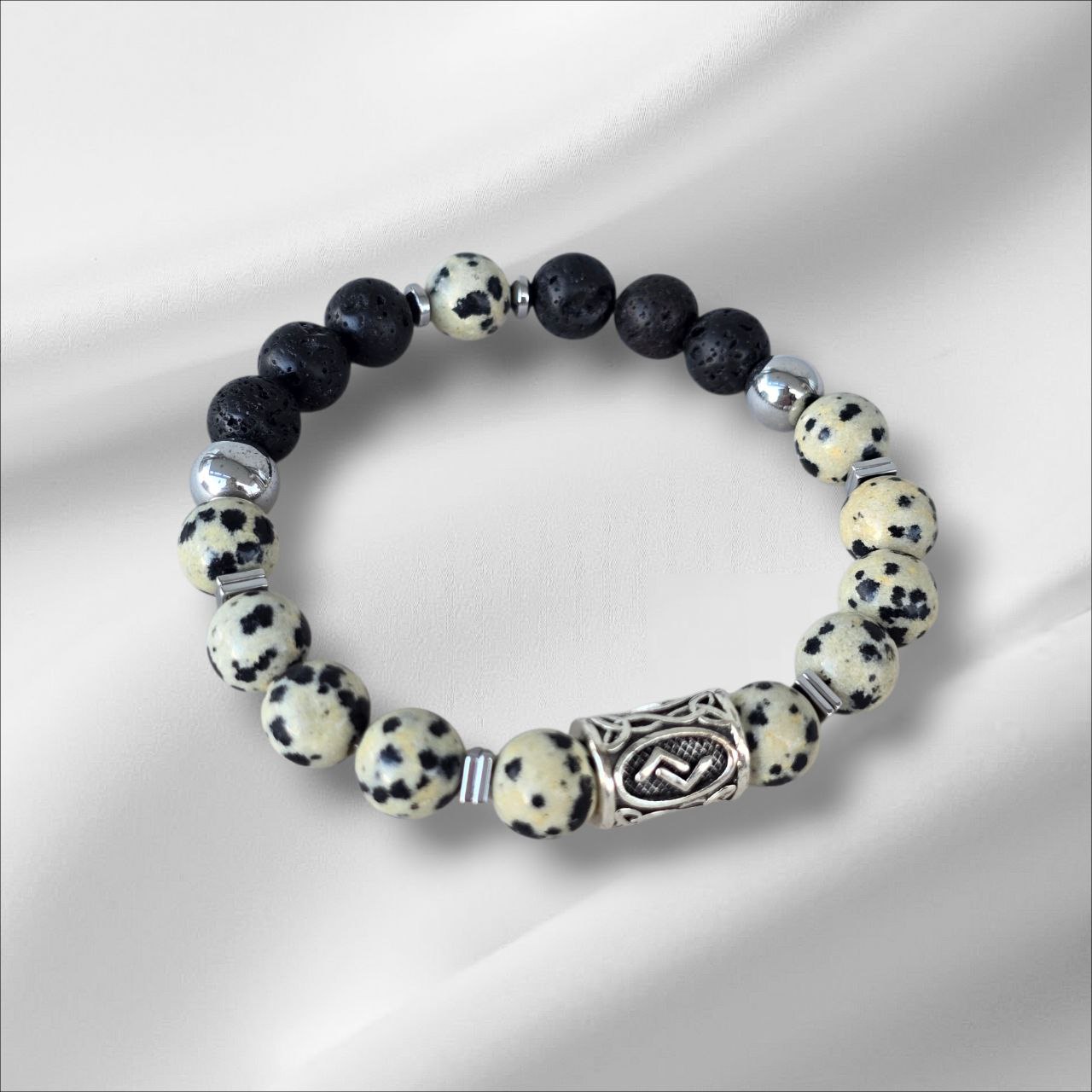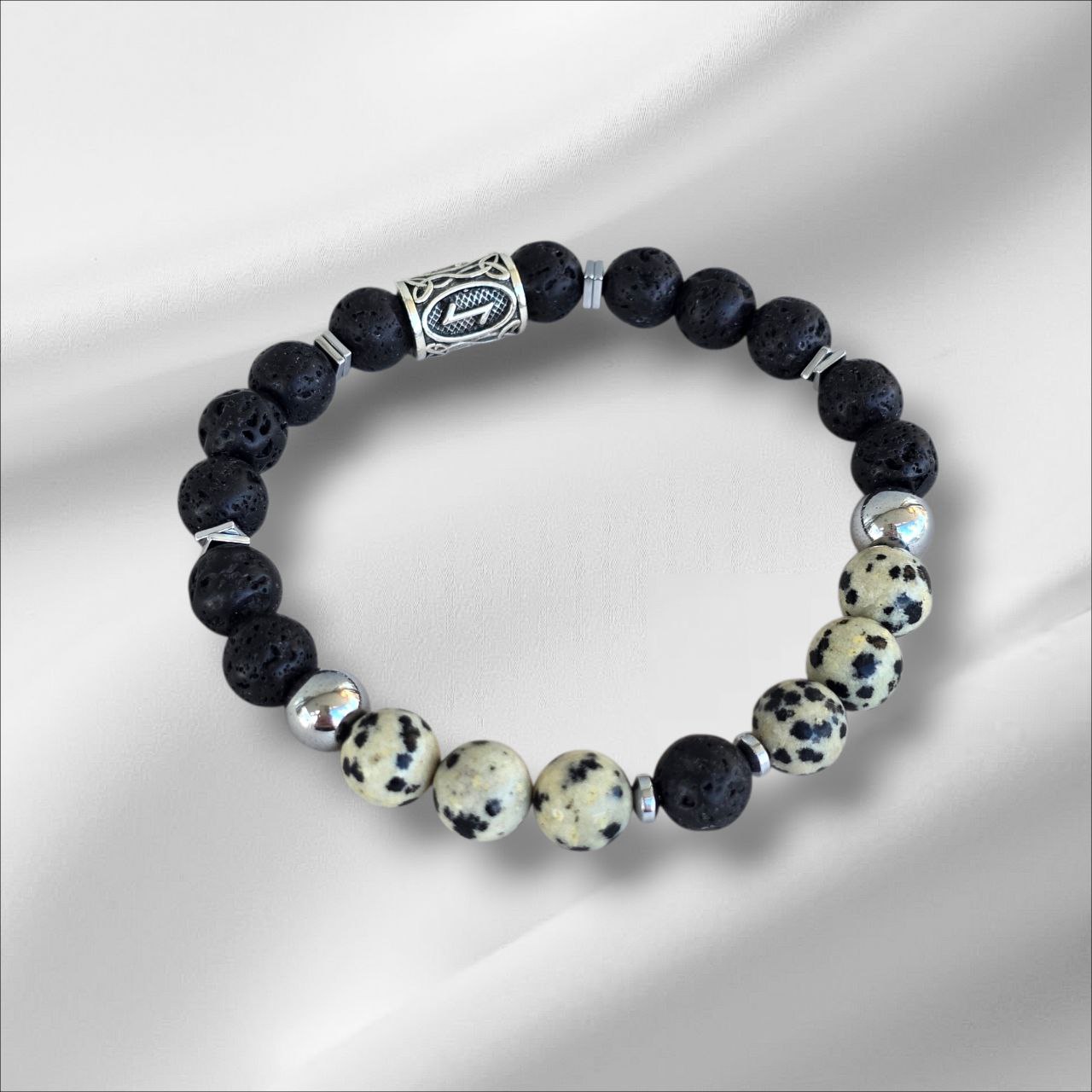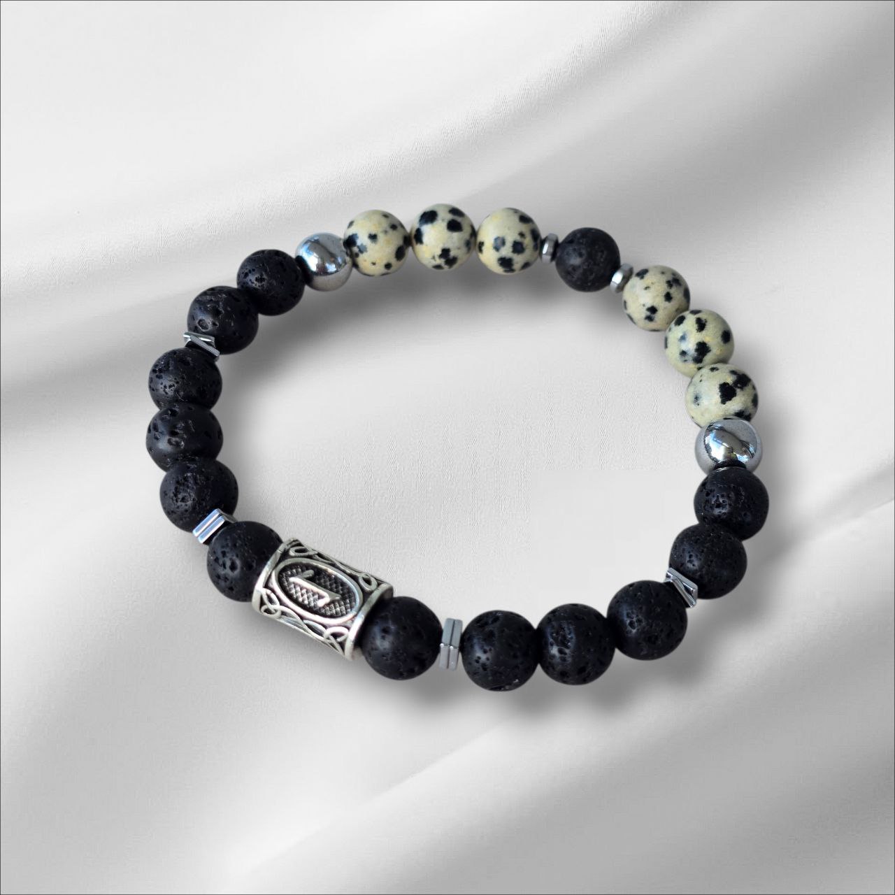 Eiwaz rune bracelet with Lava Stone, Dalmatian Jasper and Hematite.