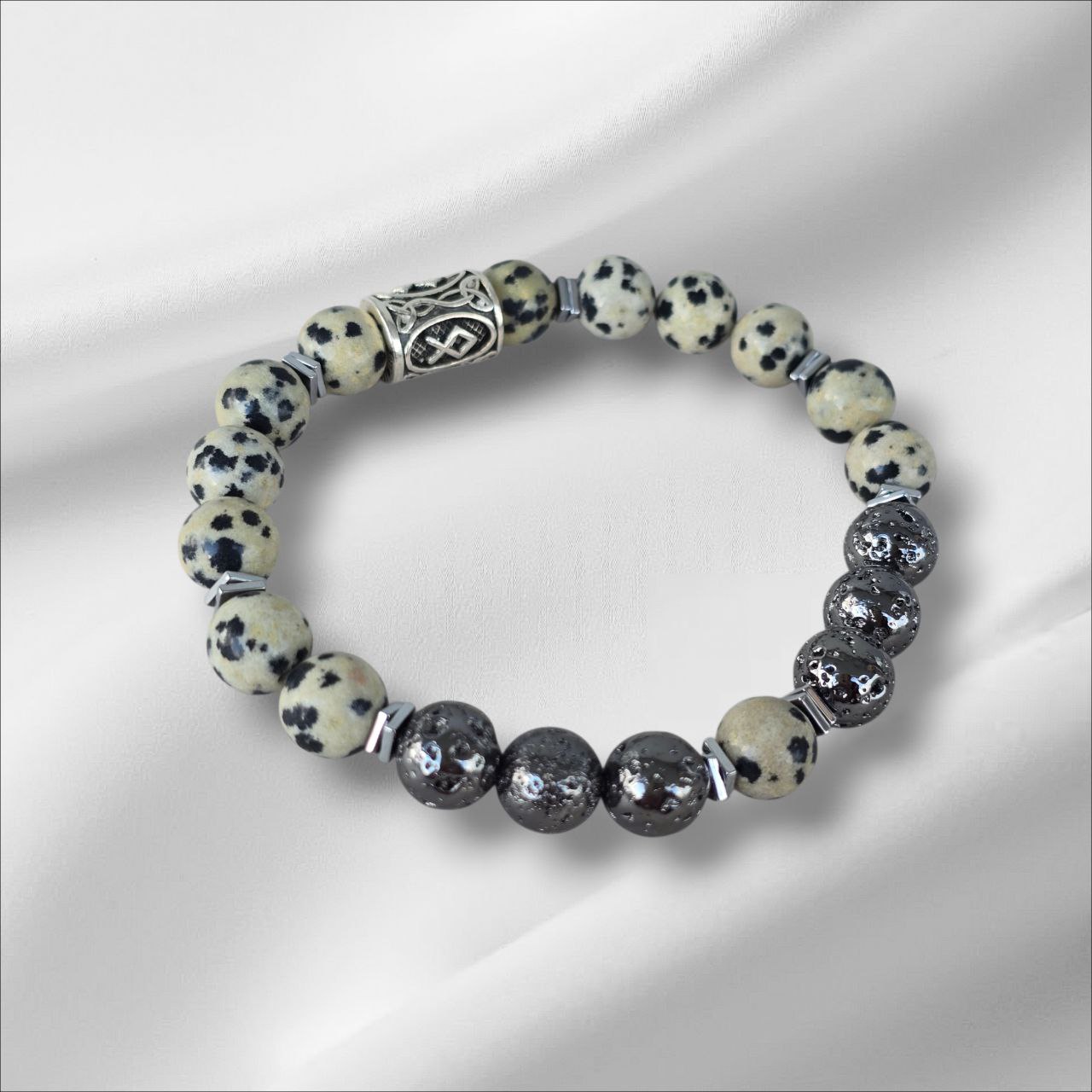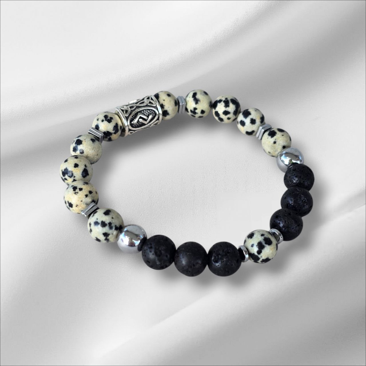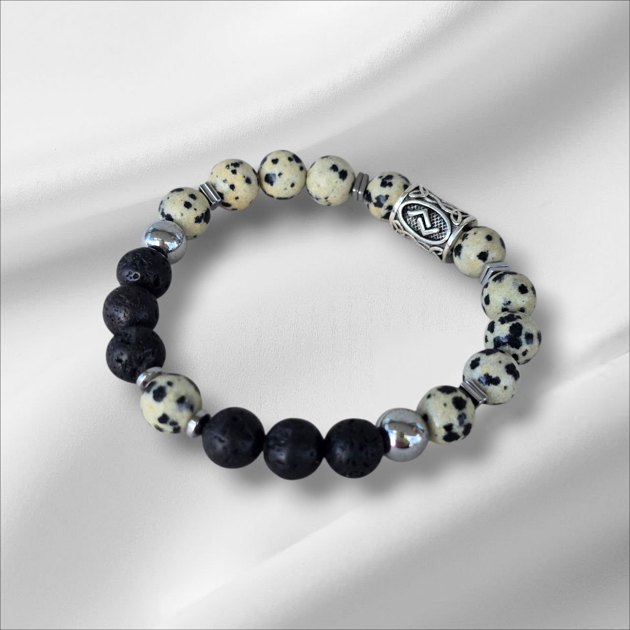 Eiwaz rune bracelet with Lava Stone, Dalmatian Jasper and Hematite.