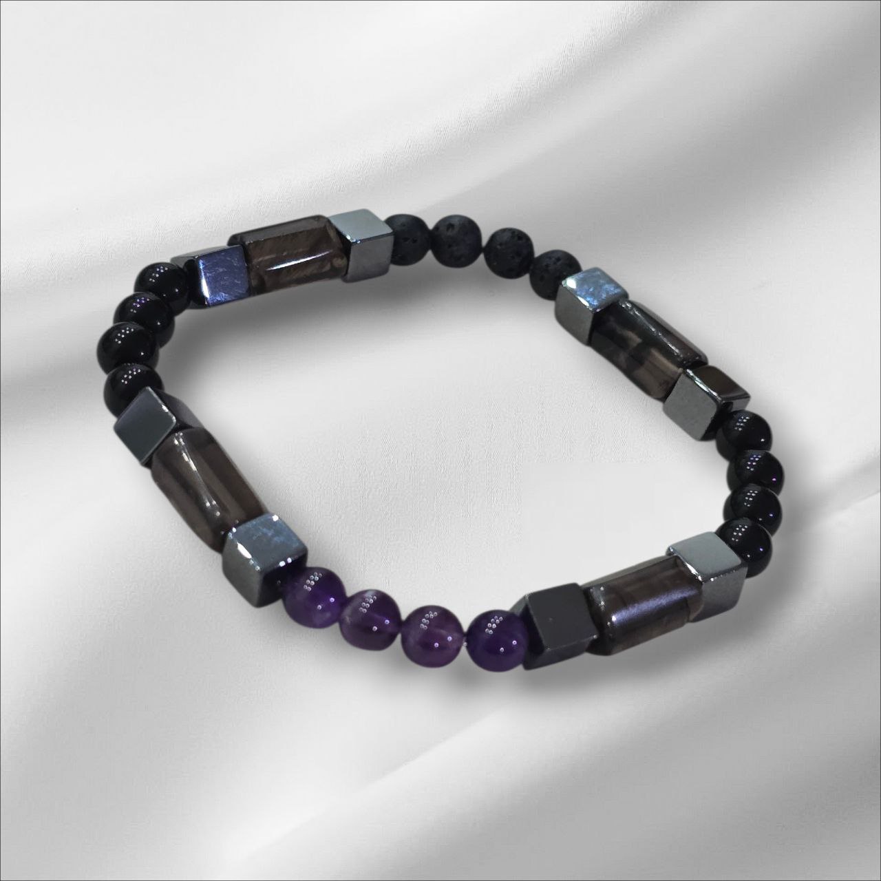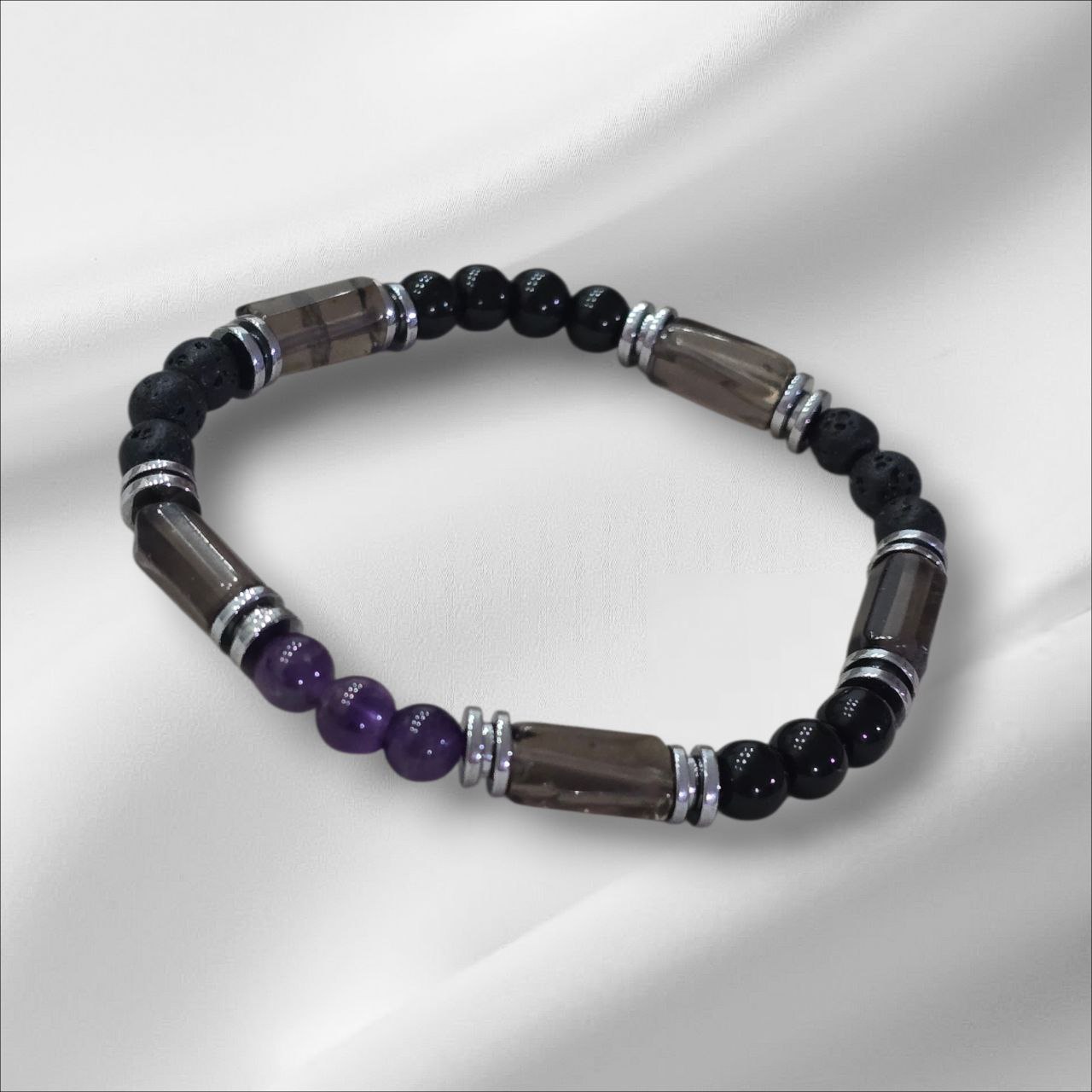 Men’s bracelet with Lava Stone, Amethyst, Hematite, Onyx and Milky Quartz.