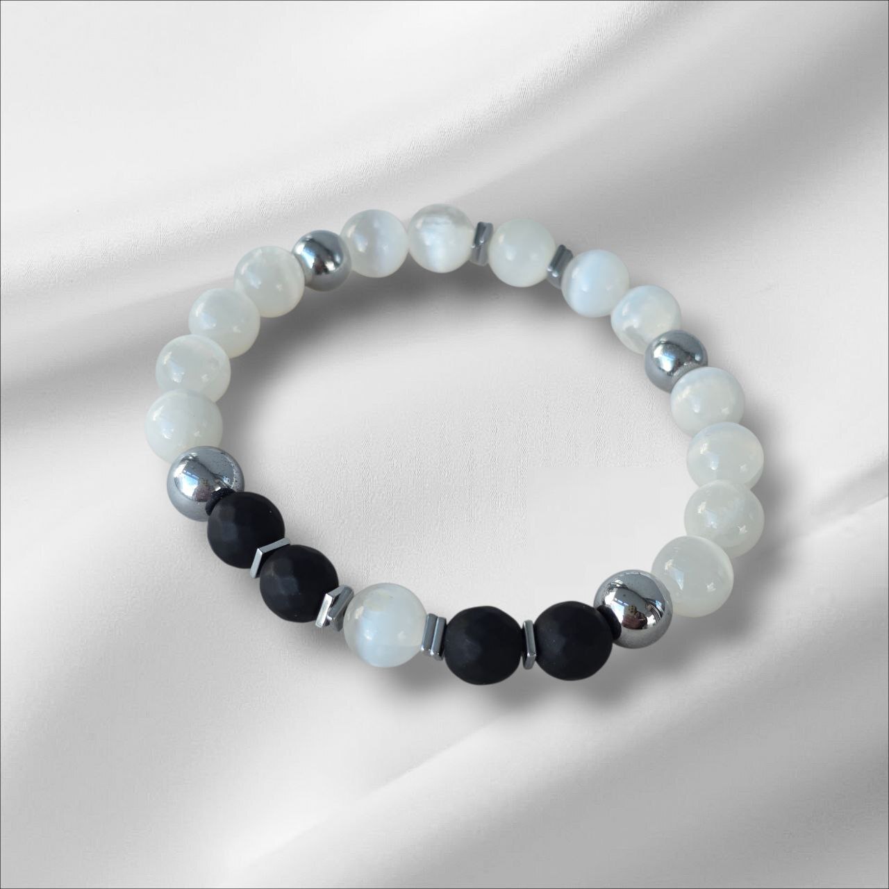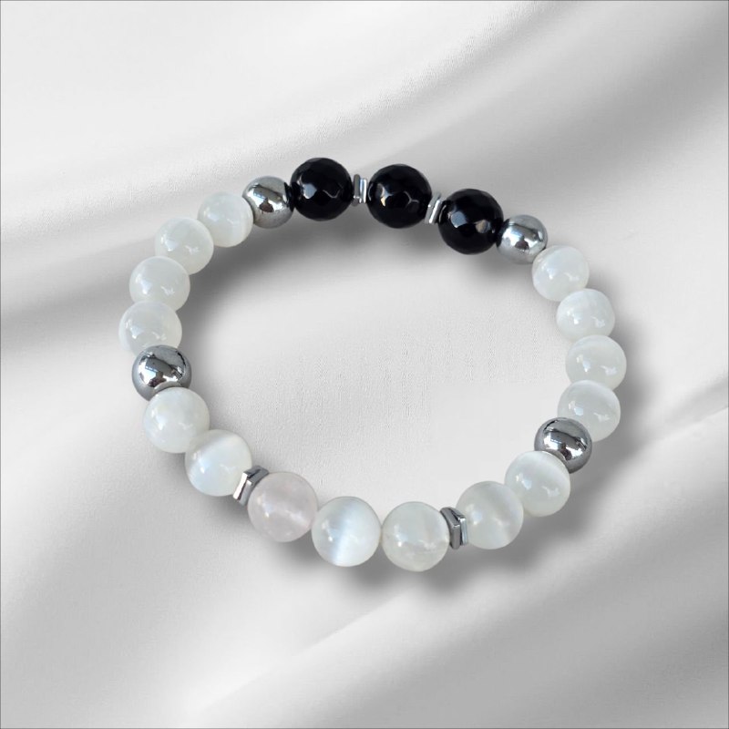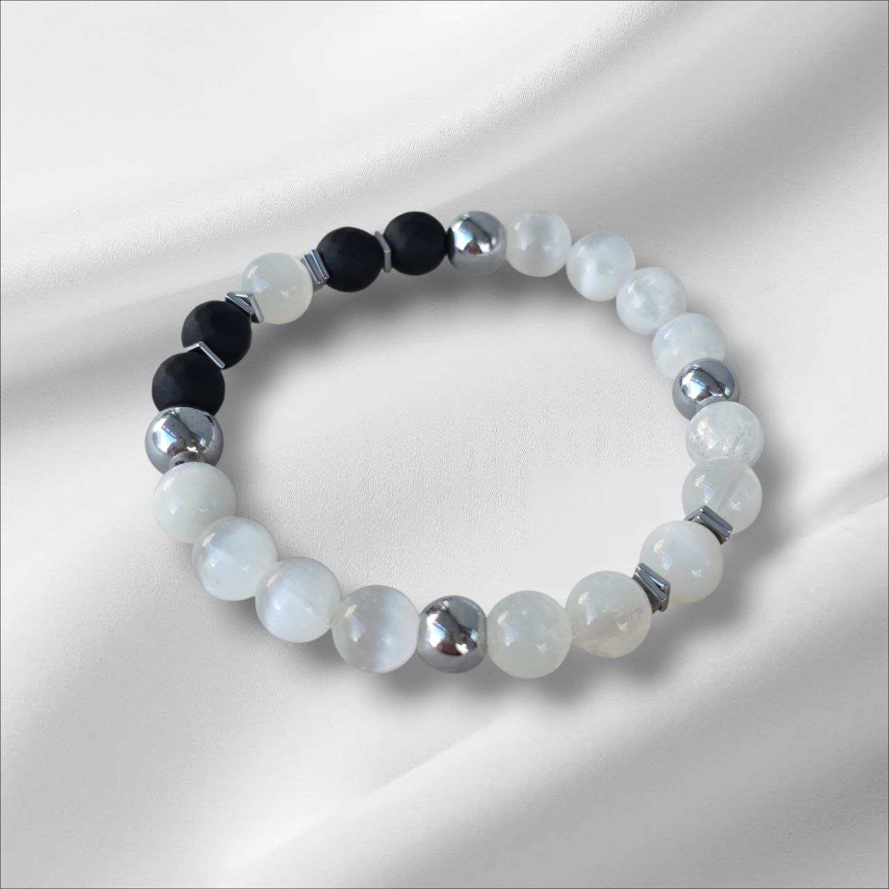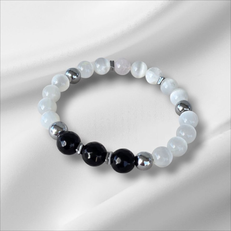 Selenite bracelet with Onyx and Hematite. Designed to protect your energy, block negative influences and strengthen your inner stability. A meaningful piece for those who seek energetic protection and conscious strength.