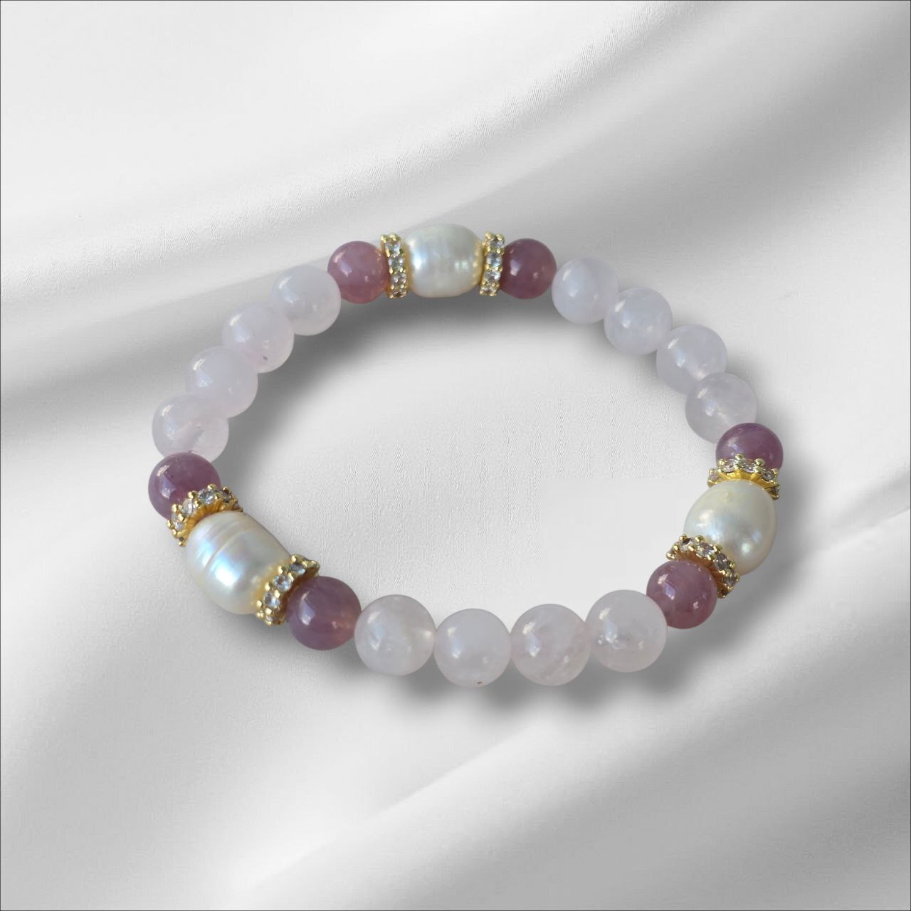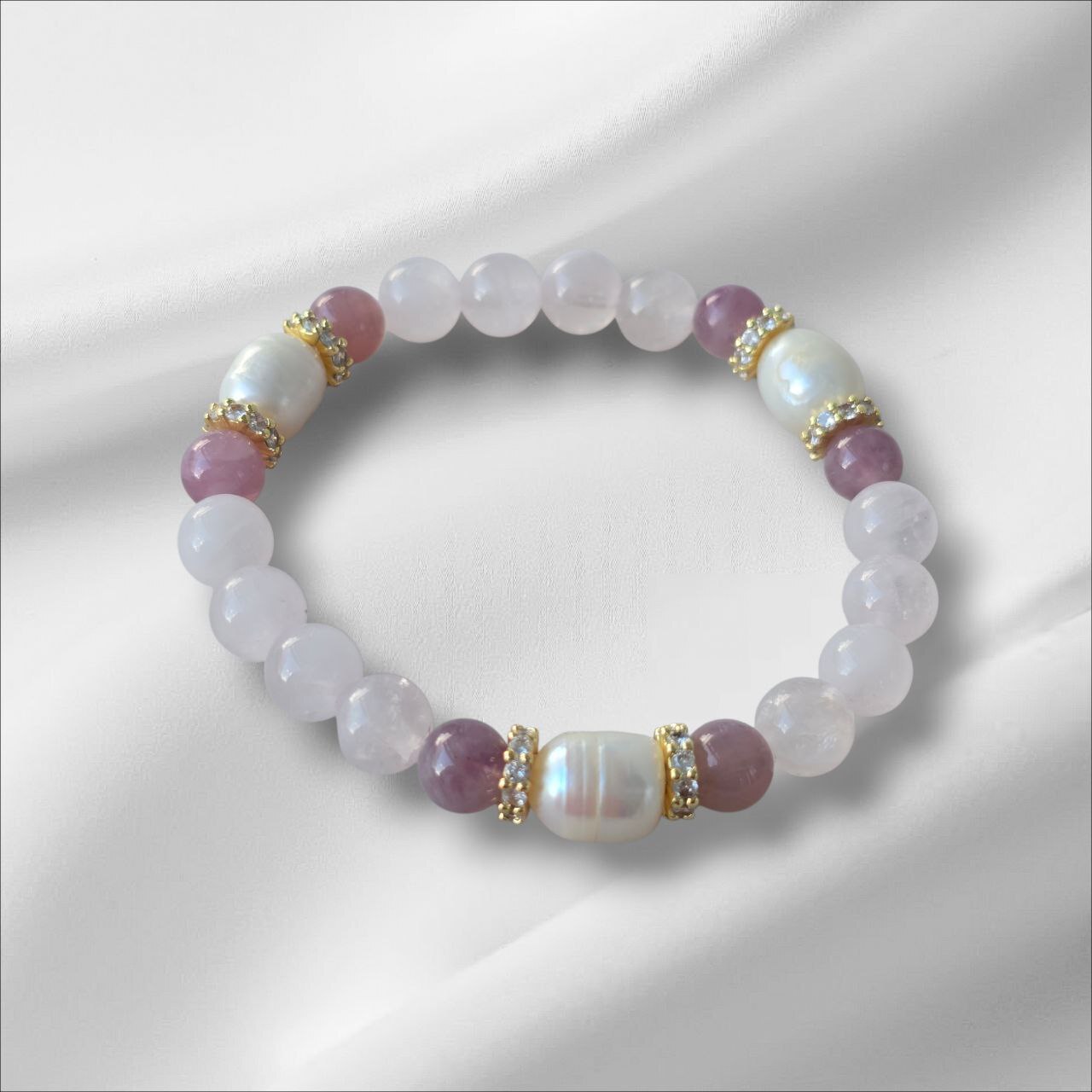 Bracelet with Strawberry Quartz, Pearl and Rose Quartz. Designed to open the heart, attract gentle love and enhance feminine energy. A meaningful piece for those who choose softness, self-love and emotional balance.