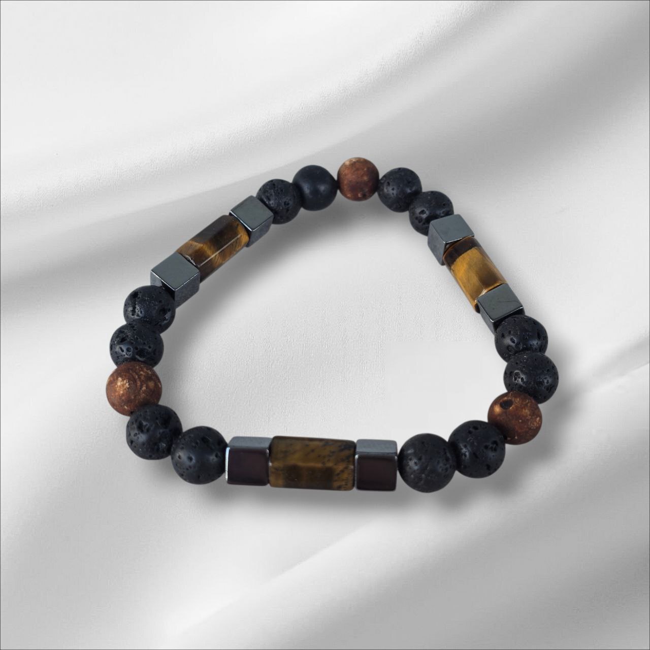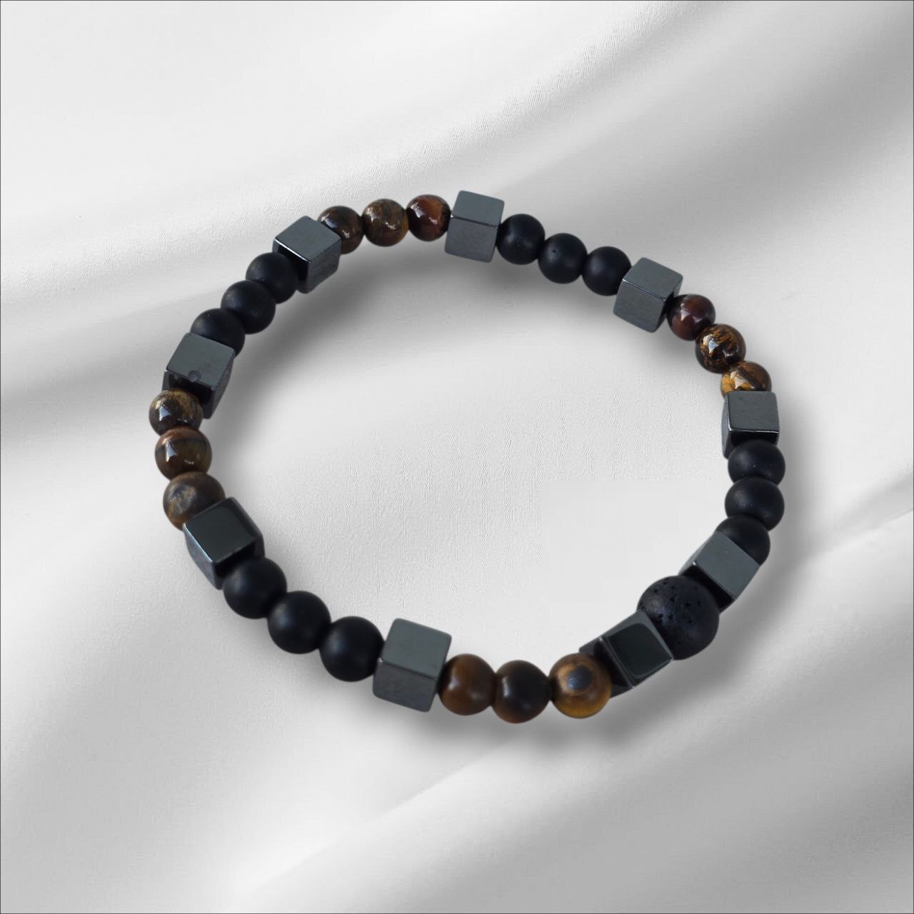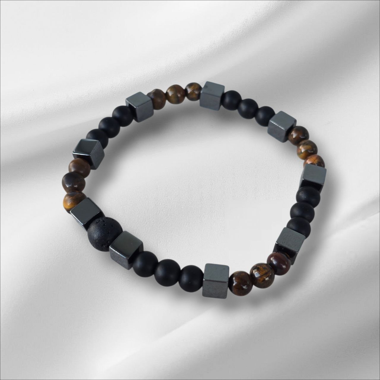 Men's bracelet with Hematite, Onyx, Lava Stone and Tiger's Eye. Designed to strengthen inner power, protect your energy and enhance confidence. A meaningful piece for men who value stability, focus and grounded strength.