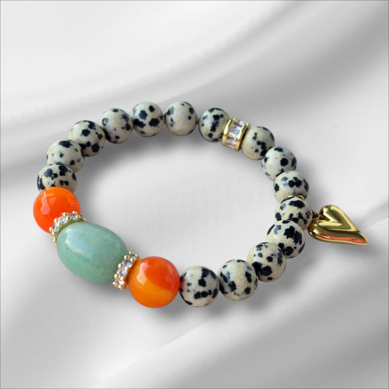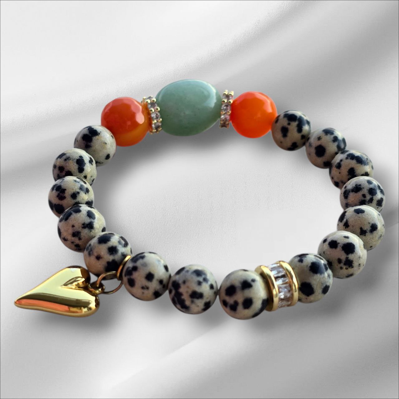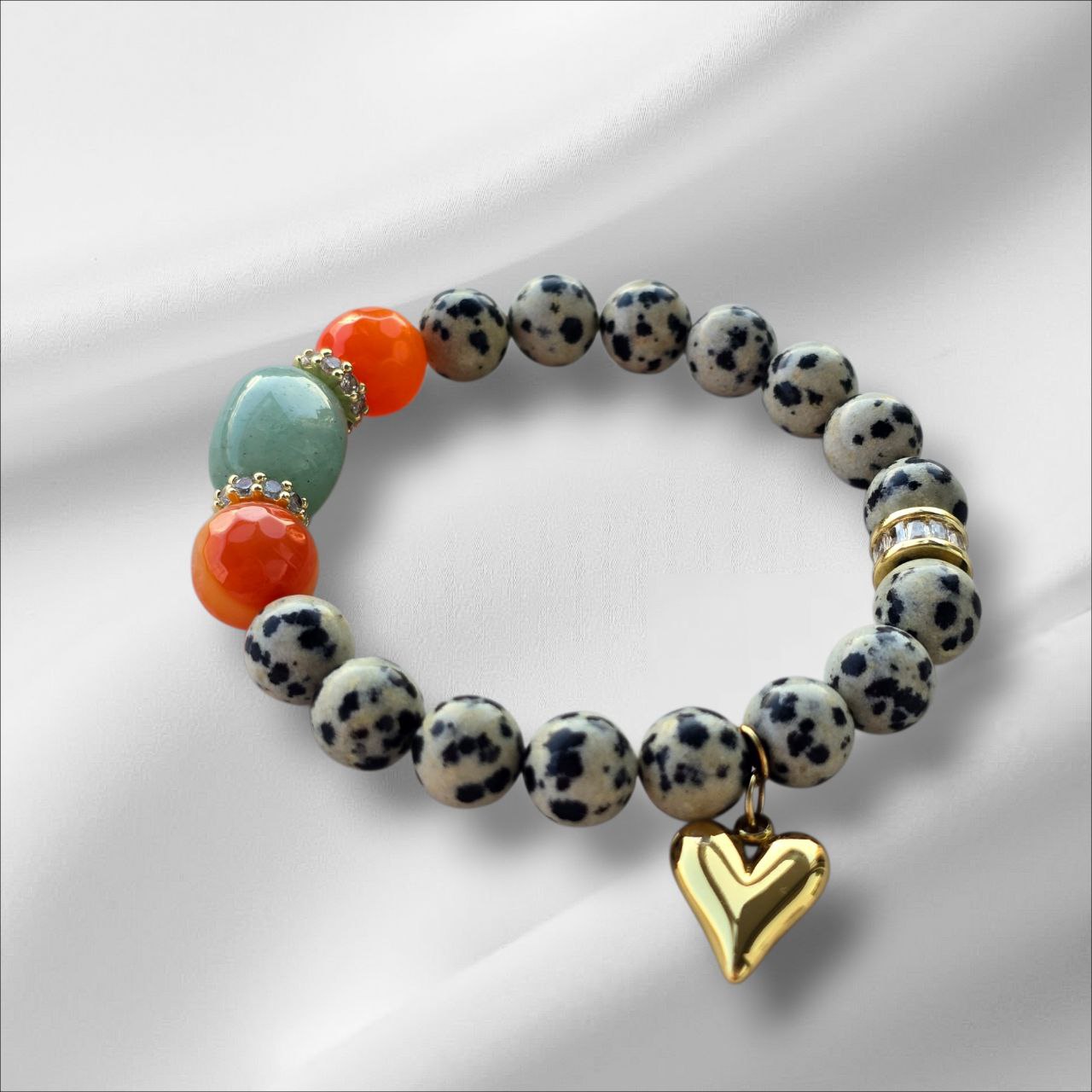 Bracelet with Dalmatian Jasper, a touch of Green Aventurine and Orange Agate.