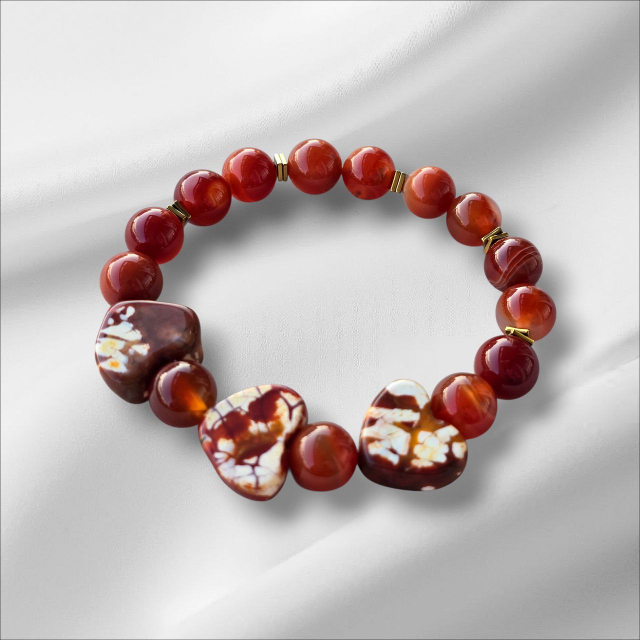 Bracelet with Red Agate and three Agate heart charms.