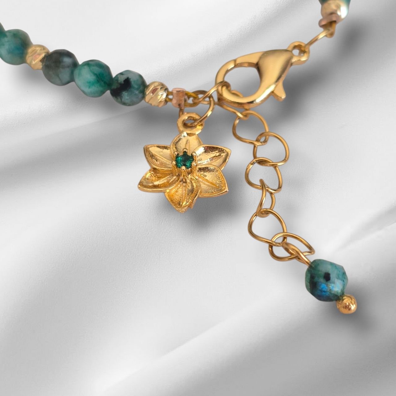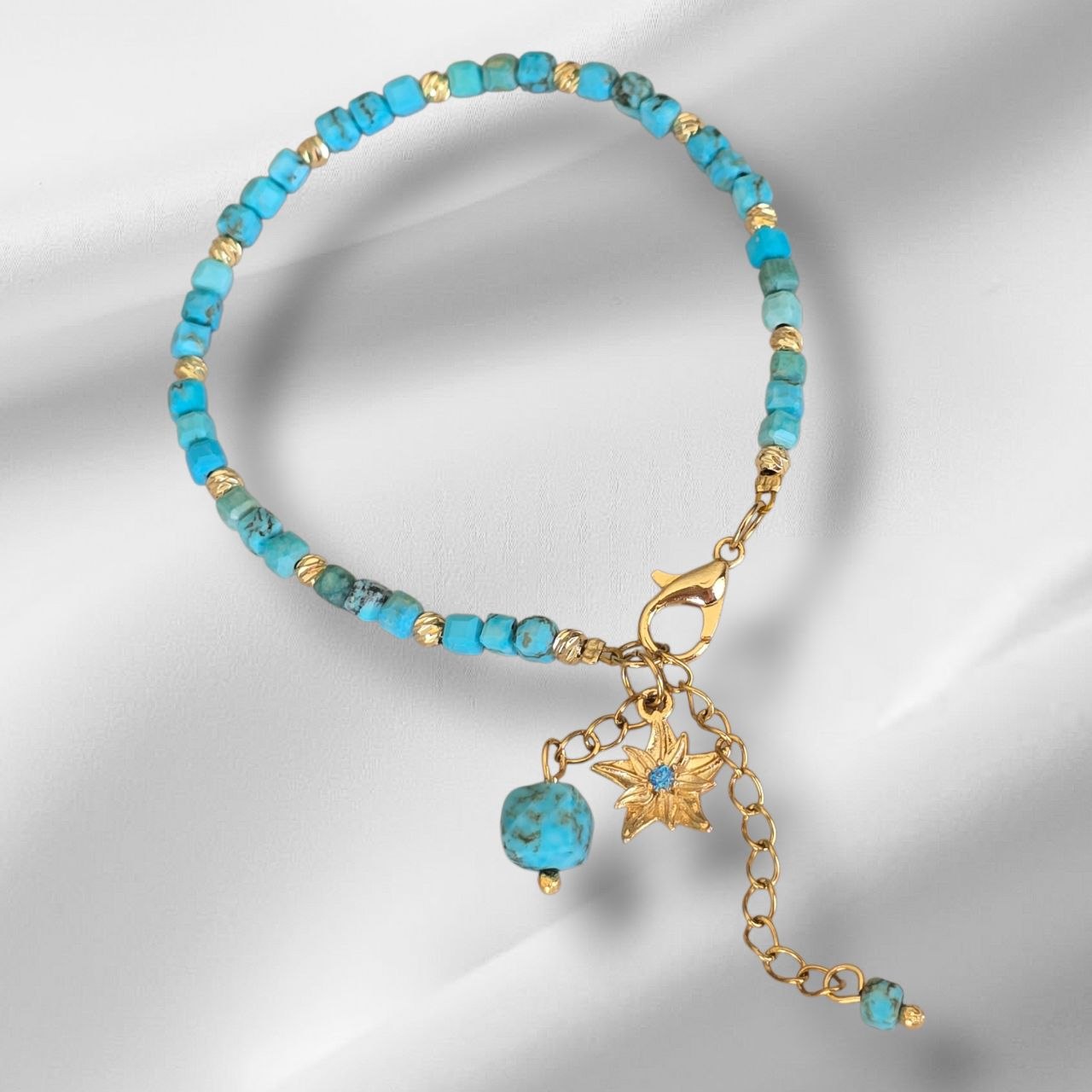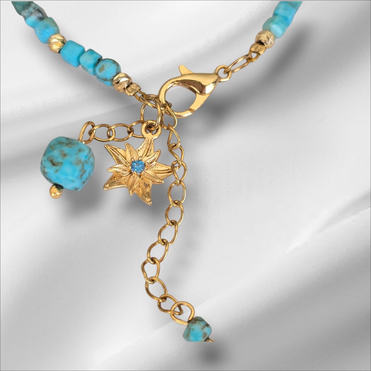 The design is enhanced with stainless steel elements, a gold-plated flower charm and an additional turquoise stone detail, adding a unique and elegant touch.