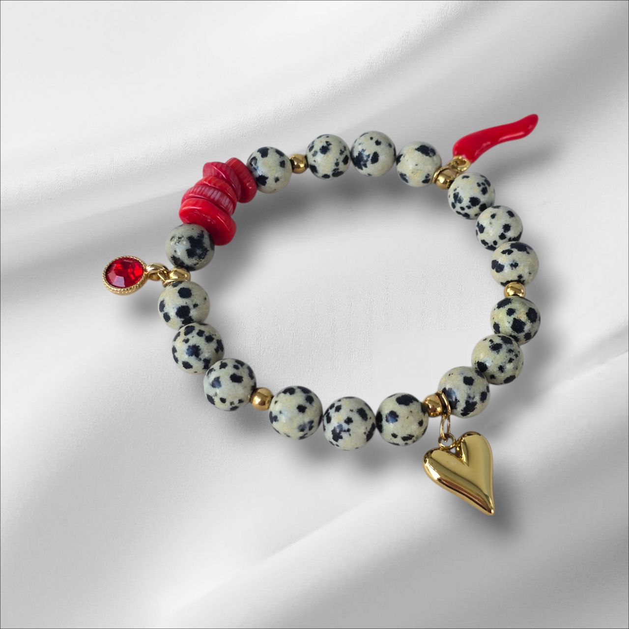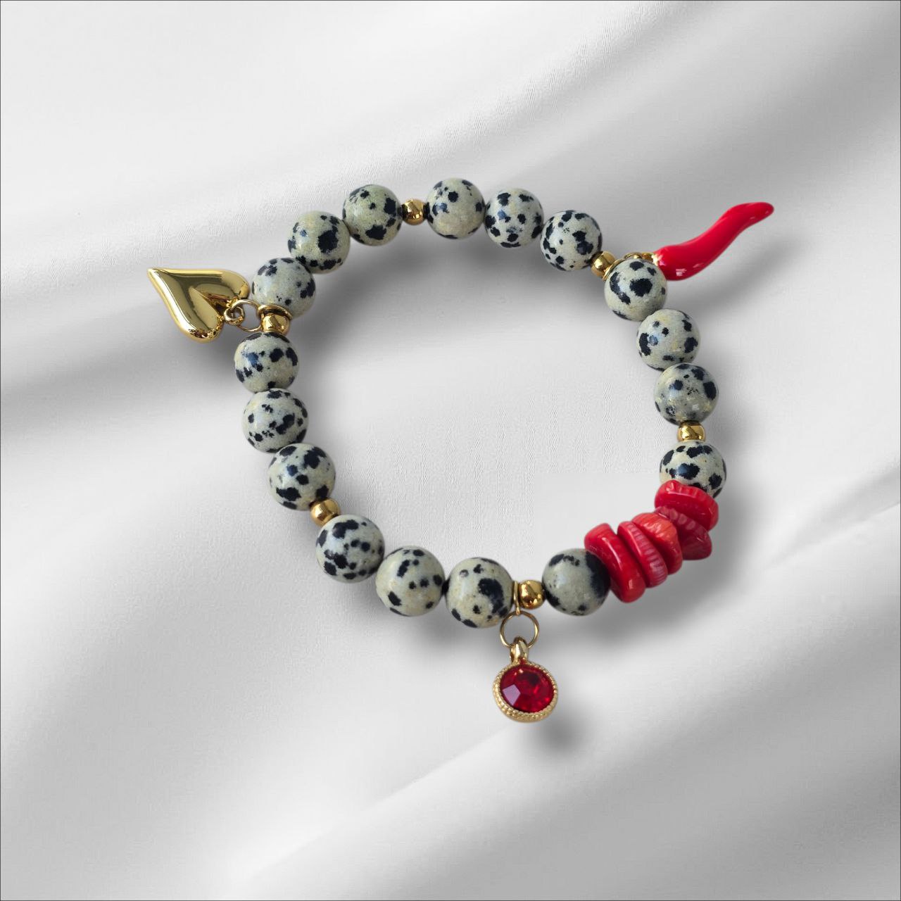 Bracelet with Dalmatian Jasper and Coral. Designed to bring lightness, restore balance and awaken vital energy. A meaningful piece for those who choose joy, harmony and emotional warmth.