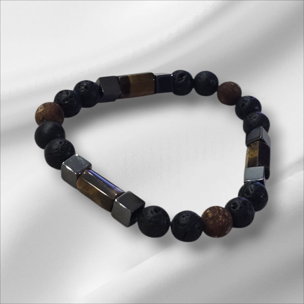 Men’s bracelet with Lava Stone, Tiger’s Eye and a touch of Hematite.