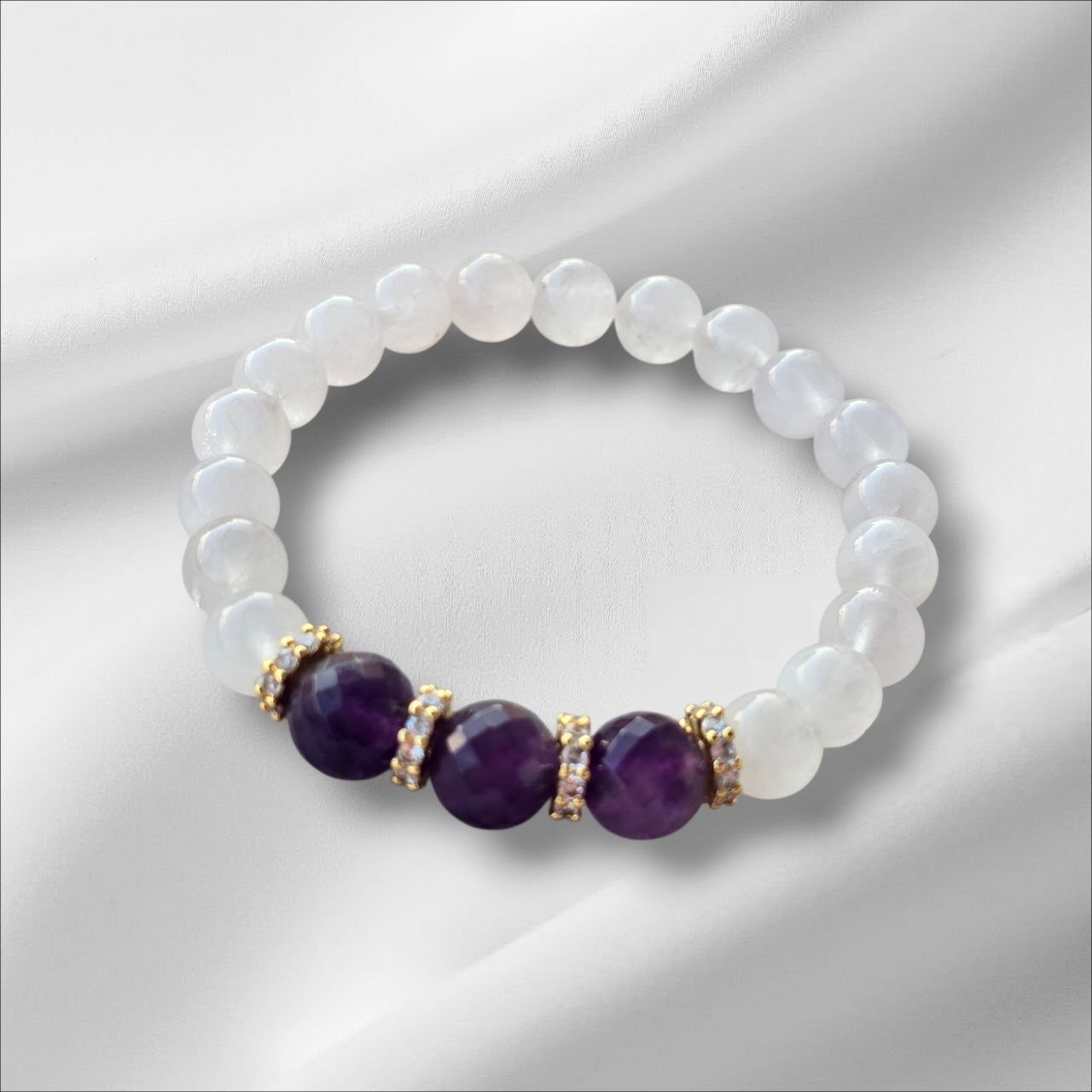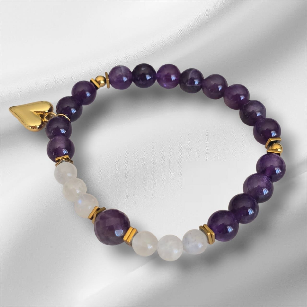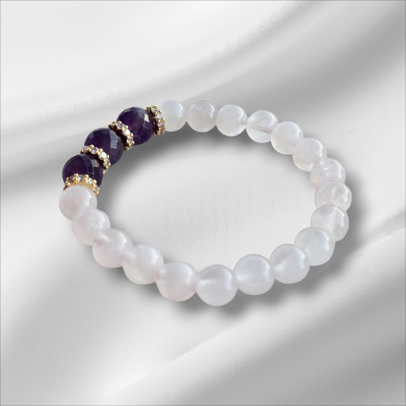 A delicate bracelet crafted with natural rose quartz and amethyst stones — a powerful combination of love, harmony and inner peace.