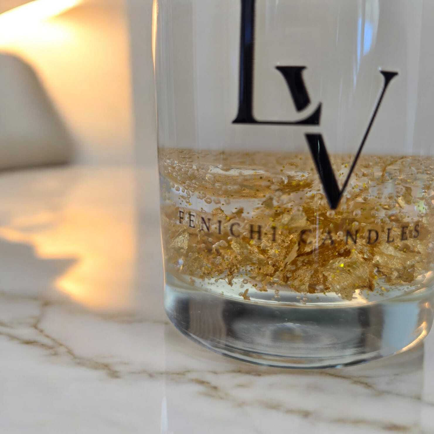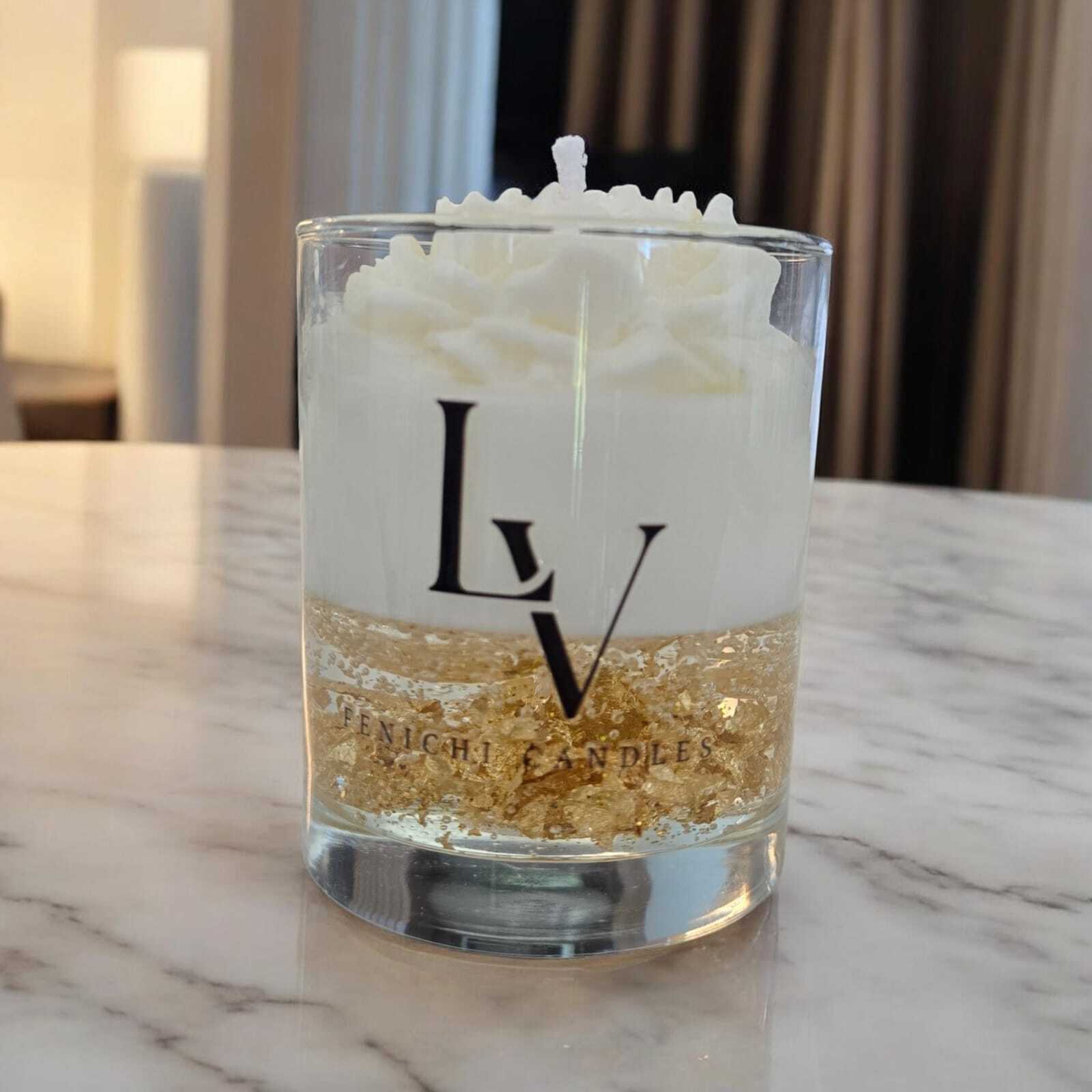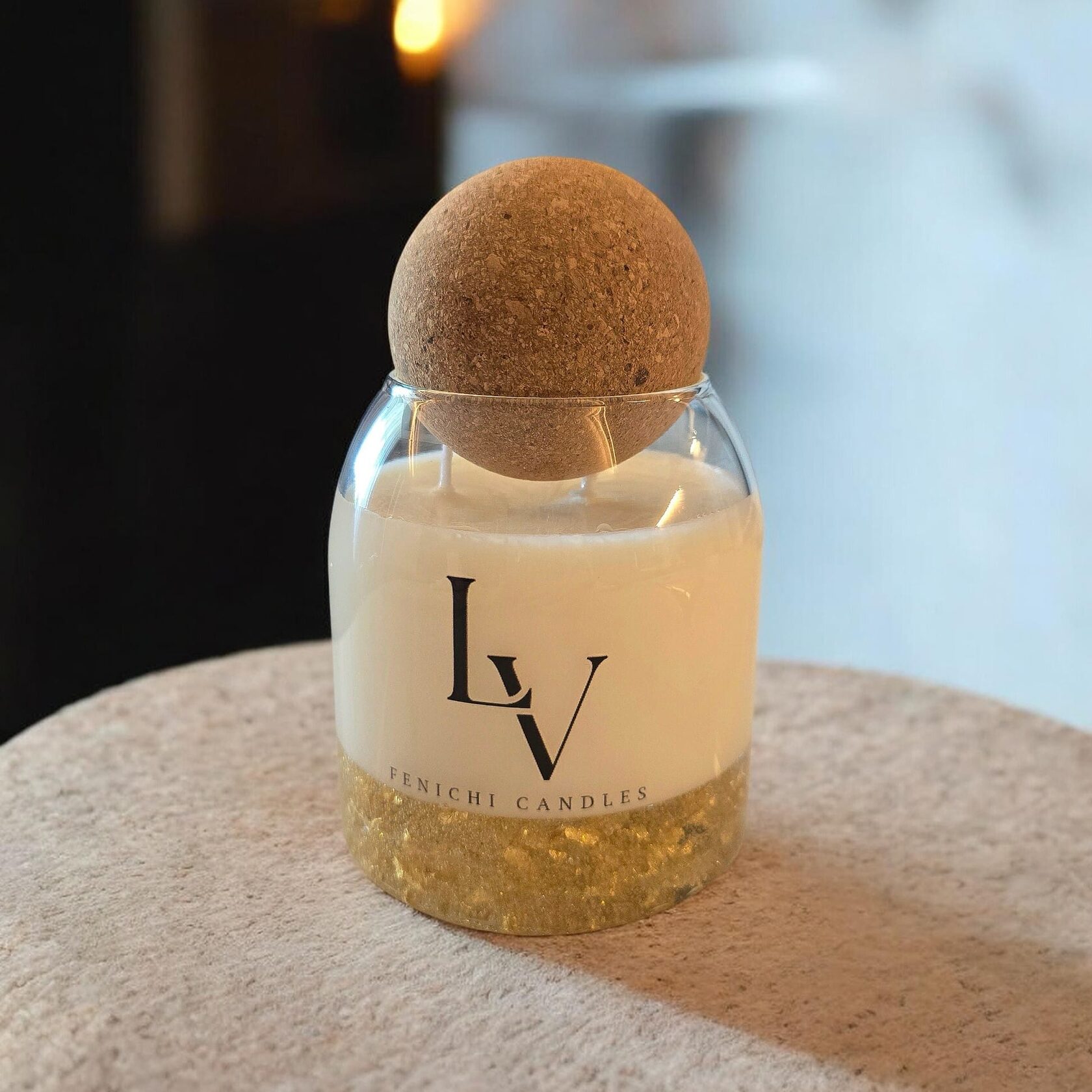 Handmade 100% Soy wax candle with a soft vanilla scent. Designed in an elegant glass jar with a natural cork lid and a decorative golden base, it adds a touch of refined luxury and aesthetic warmth to any interior.