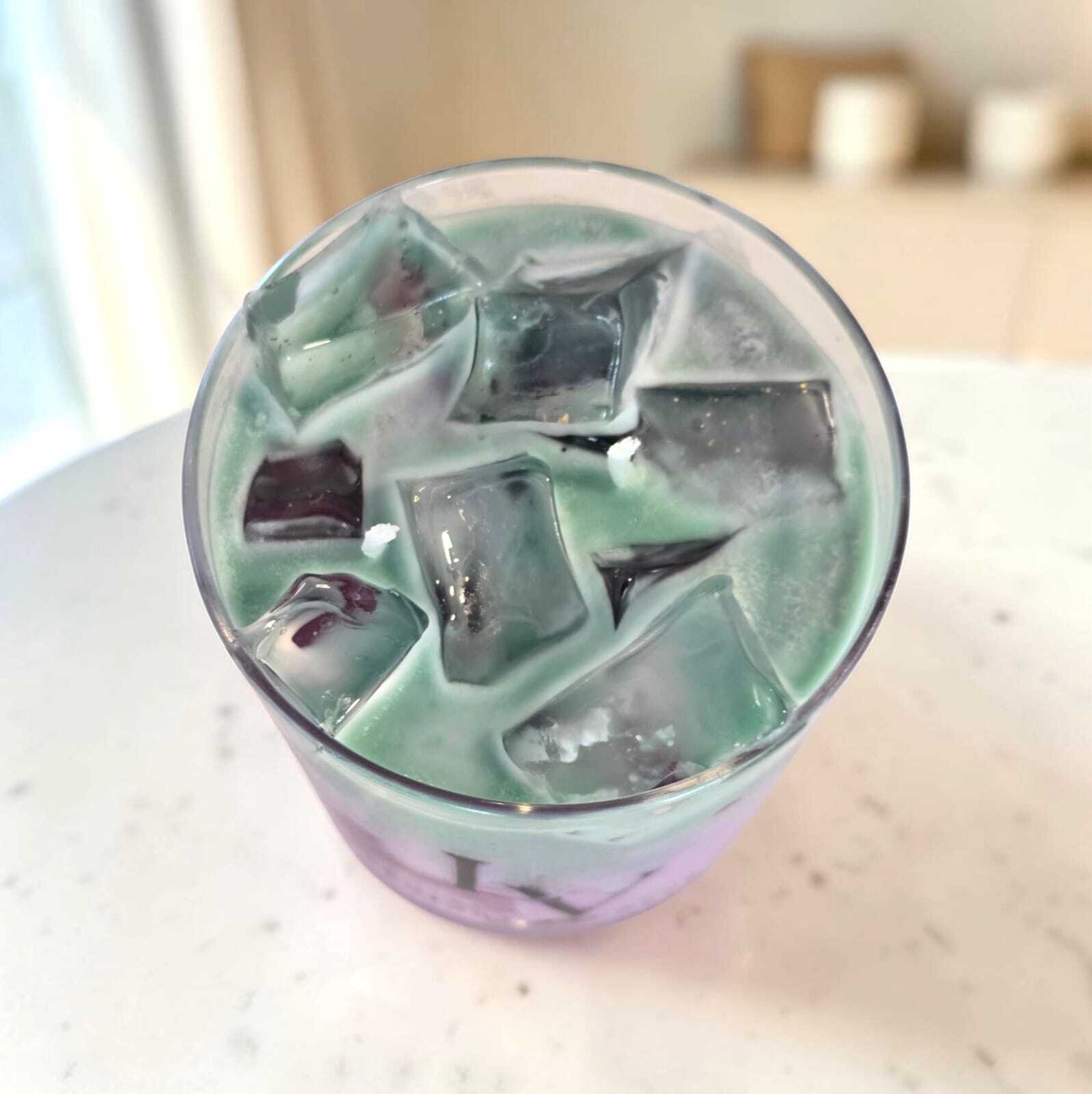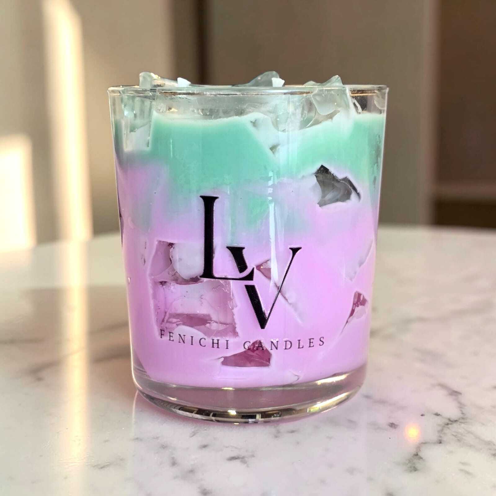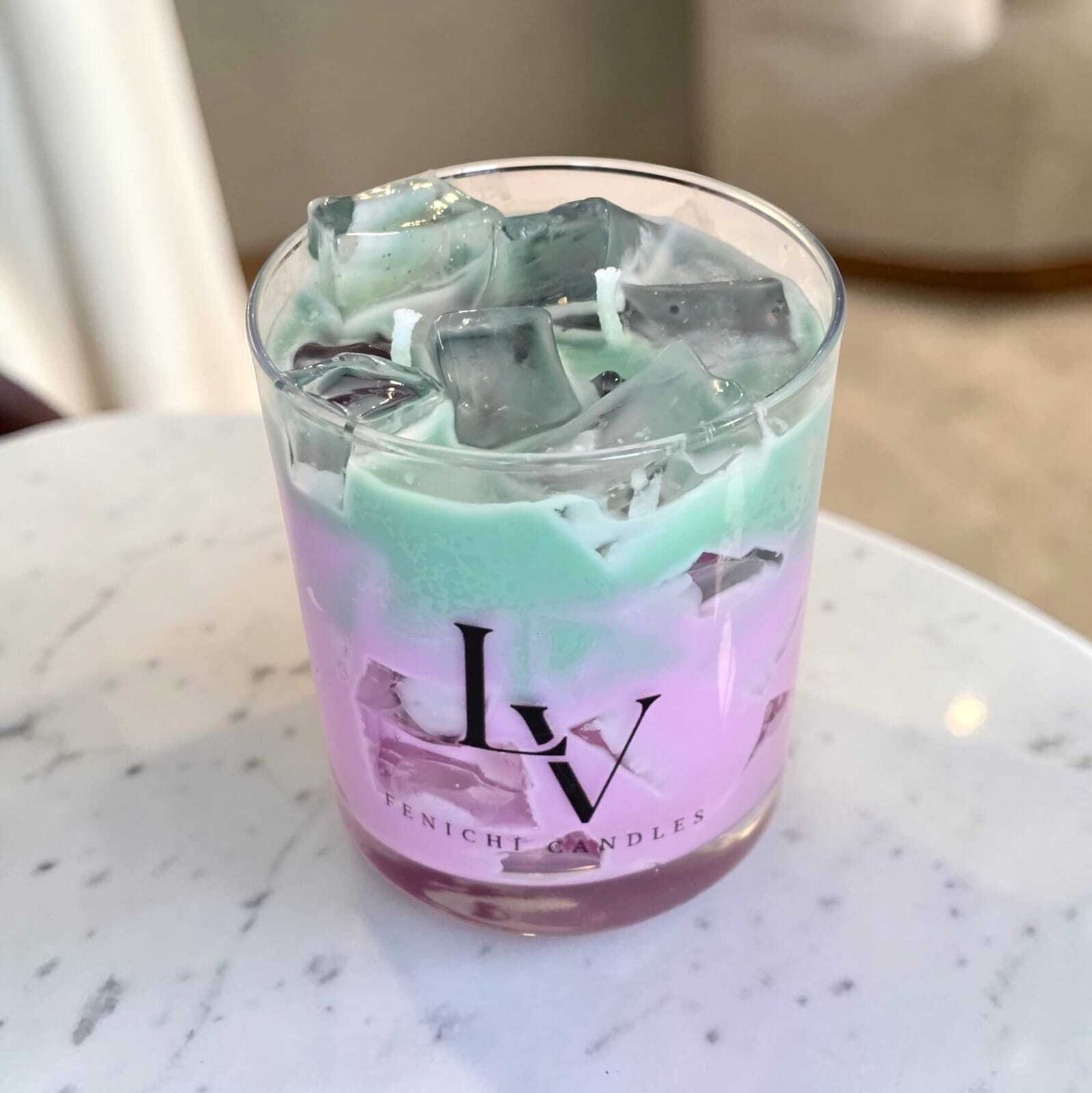 Handmade 100 % Soy wax candle inspired by the look of a refreshing iced matcha drink.