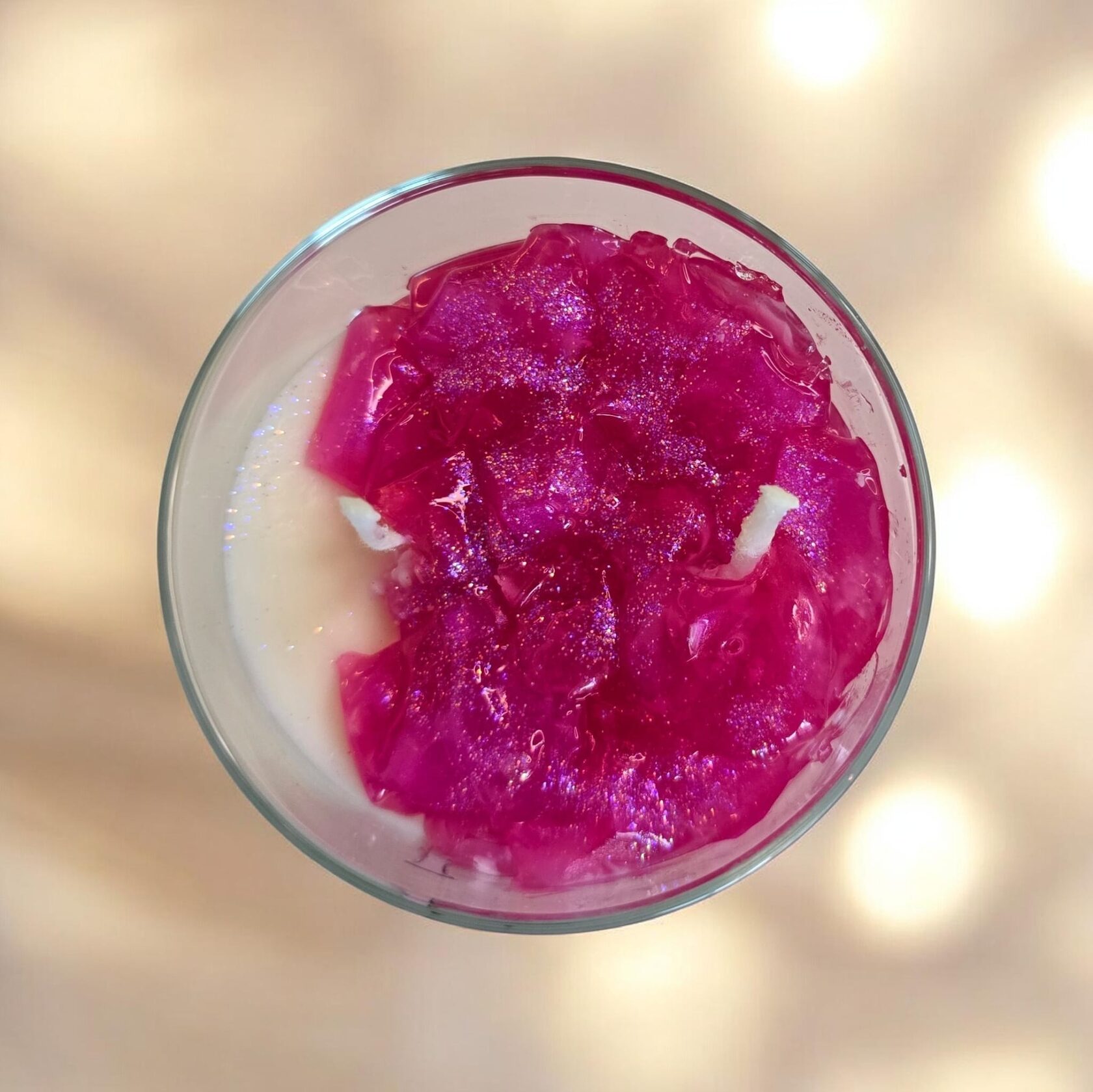 The candle combines colorful wax layers with realistic gel “ice cubes” on top, creating a fun and eye-catching design. Its sweet mango fragrance fills the space with a tropical and uplifting atmosphere.