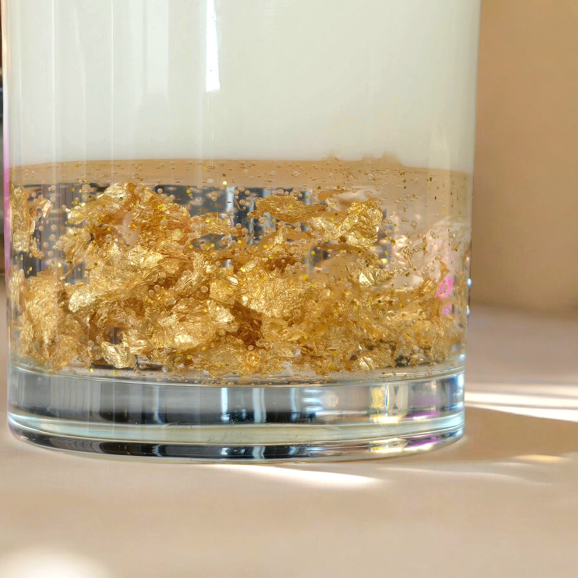 Handmade 100% Soy Wax candle with a warm vanilla scent. The lower layer is transparent golden gel, symbolizing abundance, richness and flowing energy. Created to attract prosperity, warmth and a feeling of fullness in life.