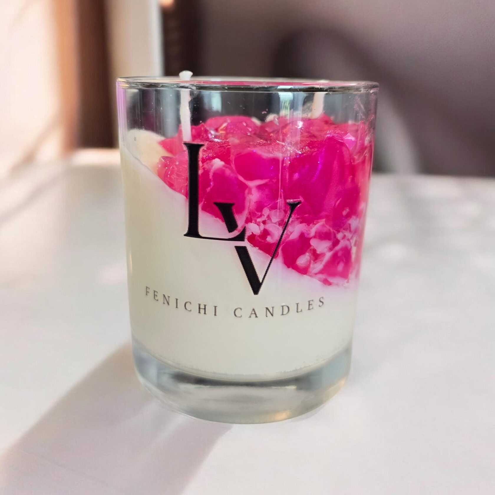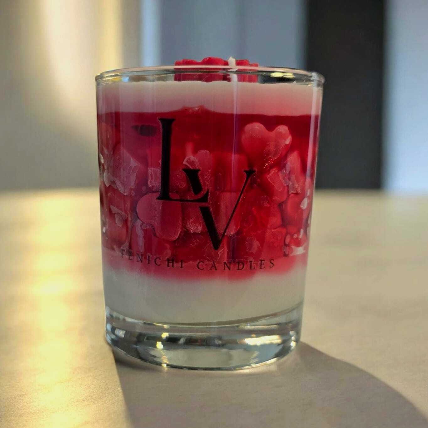 Handmade 100% Soy Wax candle with a soft rose scent. Decorated with delicate gel hearts, created to awaken feminine energy, tenderness and a feeling of inner love.