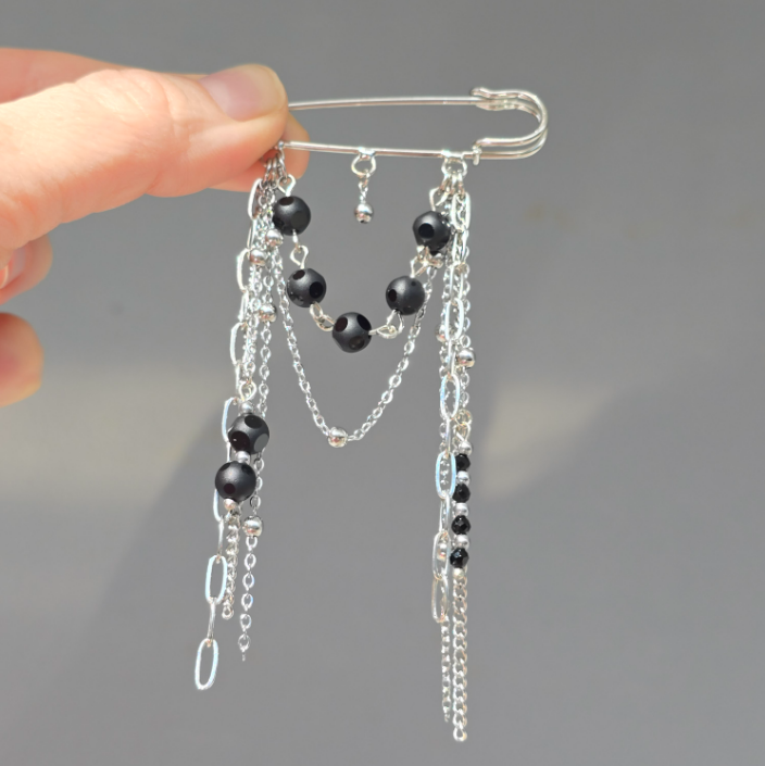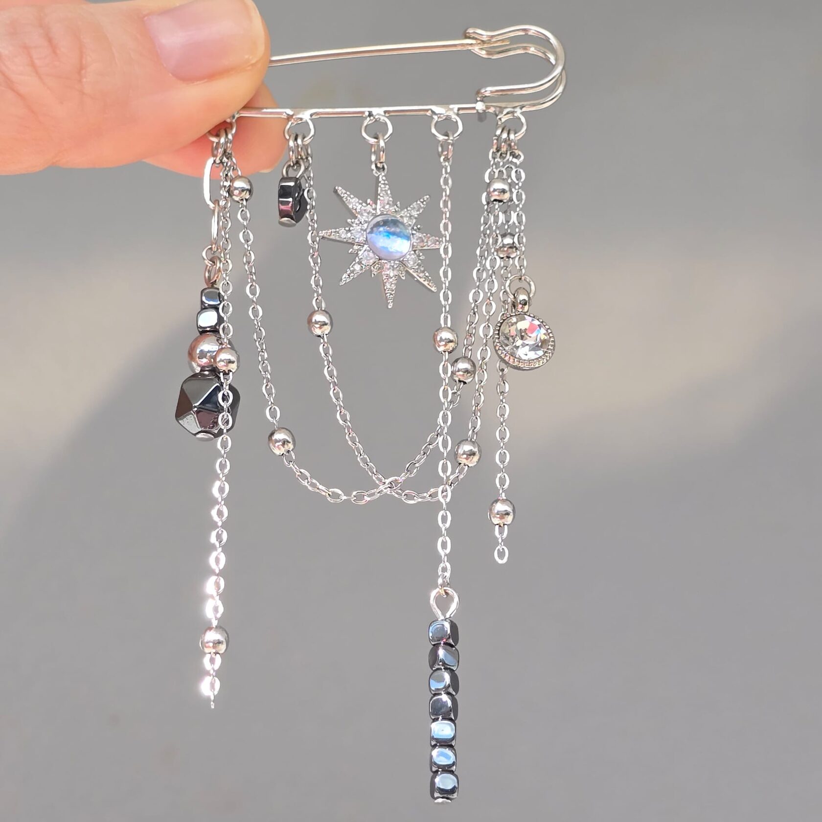 Handcrafted brooch in premium stainless steel with natural hematite accents.