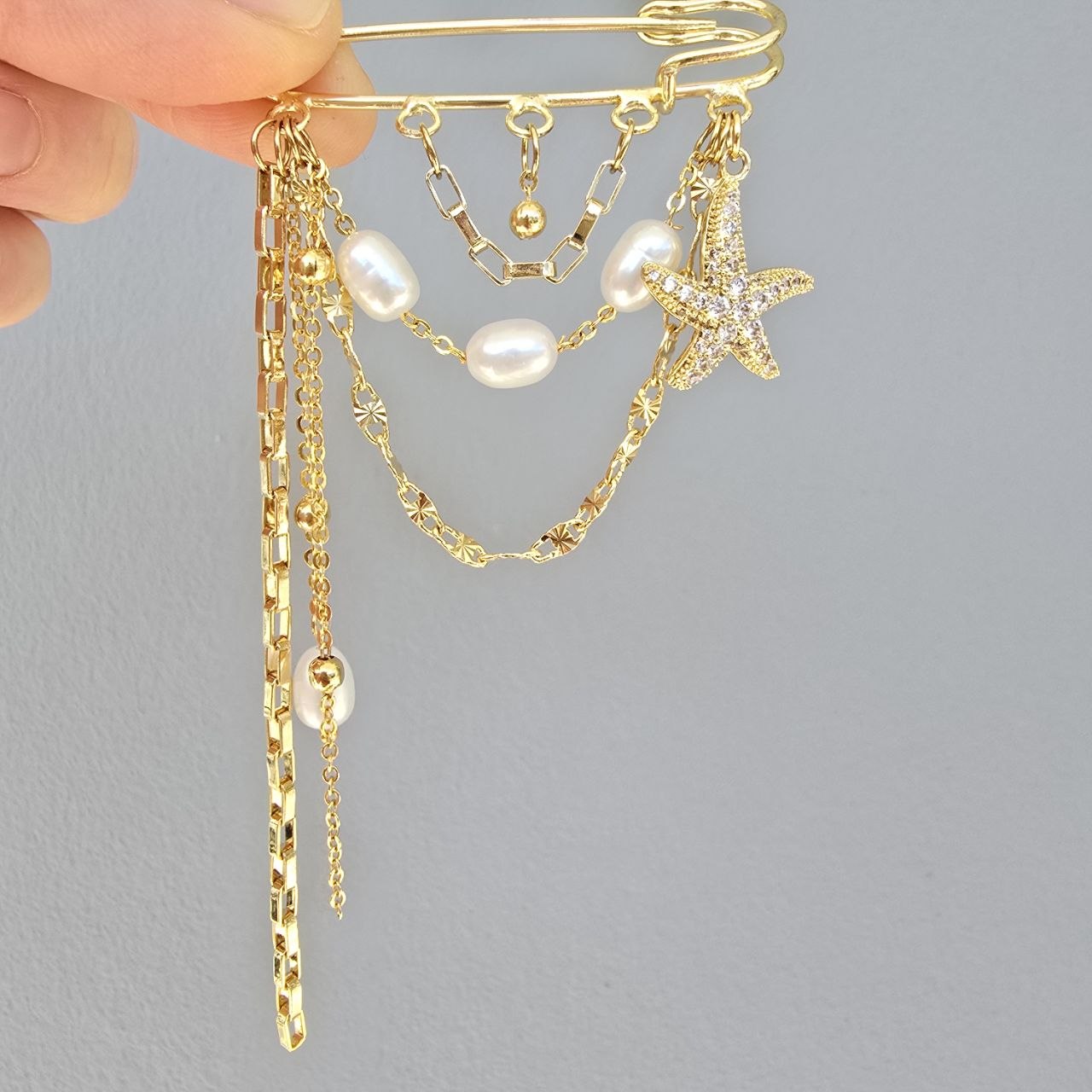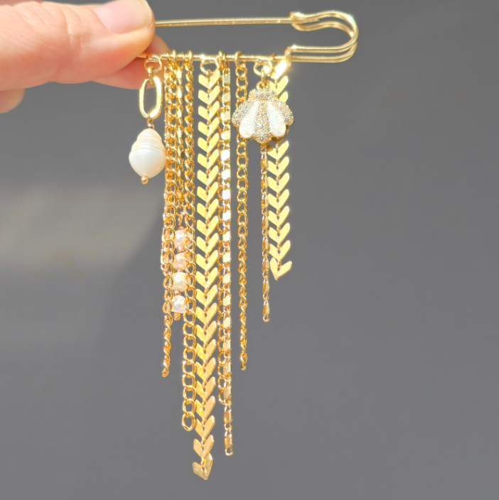 Designer brooch crafted from premium stainless steel with delicate pearl accents. Layered gold-toned chains create fluid movement and a bold silhouette, adding depth and sophistication to any look. The contrast of structured metal and soft pearl detail creates a refined yet powerful mood. Designed for blazers, evening styling and confident everyday outfits.