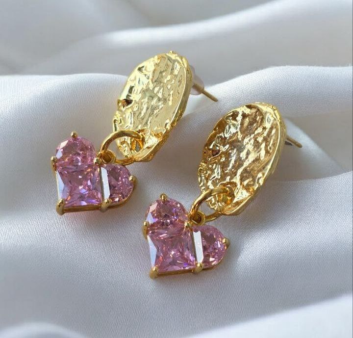 Textured gold-toned metal creates a warm, artistic base, while faceted pink heart-shaped stones add softness, light and delicate charm. The gentle movement of the drop design reflects light beautifully, framing the face with a subtle romantic glow.