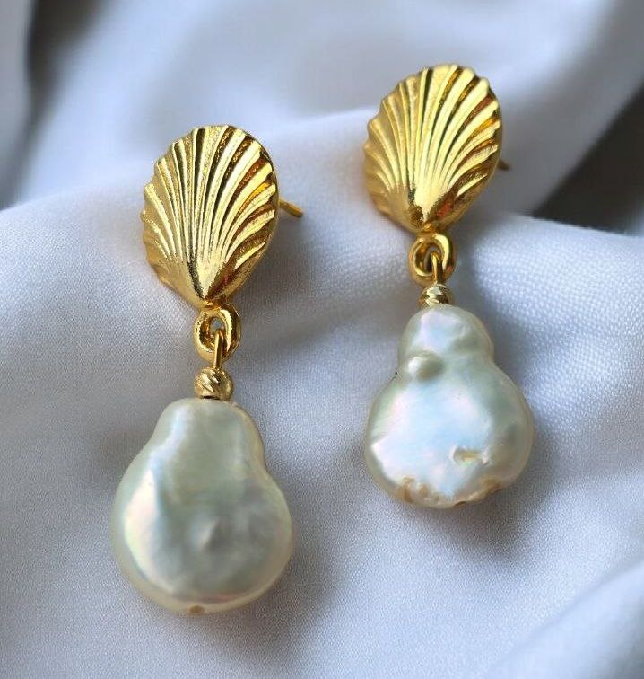 The sculptural shell-inspired top reflects a subtle ocean glow, while the organic pearl drop brings softness, light and natural elegance. Together they create a refined silhouette inspired by the quiet beauty of the sea.